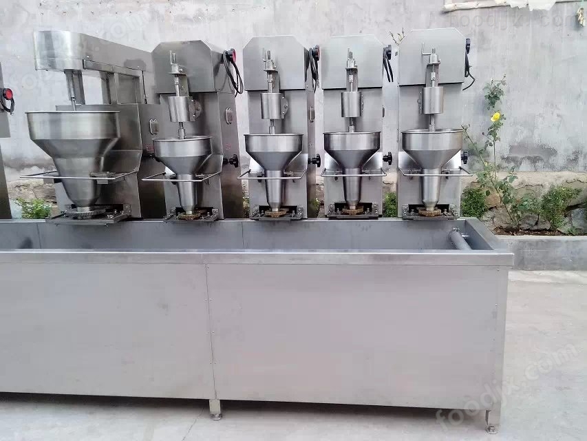 3、成型槽与蒸煮槽的水经两槽内蒸汽管道加热,水温用高温高压阀通过调节蒸流器控制,达到成型槽的水温约75度,蒸煮槽水温为90度左右。成型槽内的水通过热水循环泵形成水流,使肉丸入水后便开始向成型槽末端流动,这*动过程通过调节阀控制水的流速达到控制肉丸的流动速度,即按工艺使肉丸达到理想的成型状态。 4、成形后的肉丸需在蒸煮槽进一步蒸煮后通过旋转的拨板匀速的移动到蒸煮槽的末端。不同品种肉丸蒸煮所需时间可通过调节拨板的转速来控制。