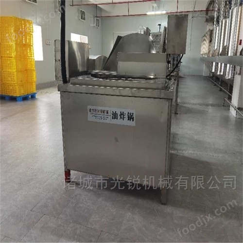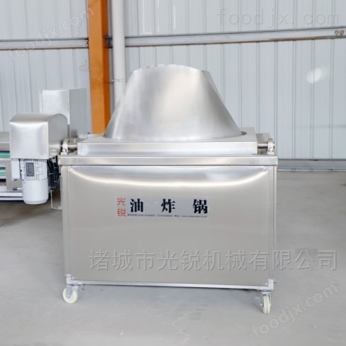 诸城市光锐机械有限公司设计的多用途小型不锈钢油炸锅304不锈钢材质制造,符合食品卫生要求。油炸锅采用的高低温油技术,下部的低温油对炸油进行过滤、清洁、保鲜,减少炸油中的有害物质,保证了炸油不变黑,从而大大延长了换油周期,节油效果好,并且炸出的食品味美、色鲜,有利人体健康;该设备的智能型数字显示温控器装置,根据被炸食物选择好温度后,它会自动控制电路的通断情况,以保证油炸时的恒温。这样不仅大大降低能耗,节约了用电量,而且使操作简便、快捷,简洁明了,操作方便。根据炸制的食物的不同,油炸锅可以带搅拌,也可以不带搅拌;这种油炸锅可以一锅多用,可以油炸花生米、蚕蛹、蚕豆等豆类、坚果类、膨化类等多种产品的油炸,也可以油炸蜜三刀等面食。如油炸花生米时,花生米油炸后快速使用甩油机甩油,由提升机提升到摊凉线进行摊凉,这样就可以保持花生米的鲜艳色度。一米的单锅20分钟能油炸150斤左右,100斤左右的花生米10分钟左右出锅。该油炸锅主要是利用油的温度关系,对油层进行加温,油温在0—260℃之间可调,而下面油层温度却保持在55℃以下。
