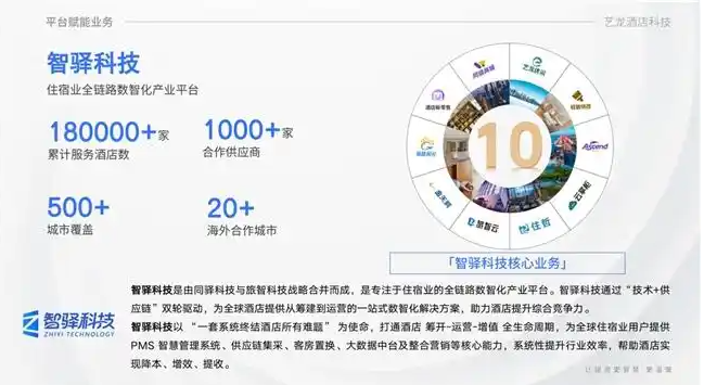 同时,平台已实现产品化、标准化输出。目前,艺龙酒店科技中台供应链公司——智驿科技(由同驿科技与旅智科技合并而成),综合提供PMS智慧管理系统、供应链集采、客房置换、整合营销等服务,累计合作酒店已超过18万家,以远超体系内酒店规模的服务范围覆盖海内外众多城市。艺龙酒店科技逐渐成为以技术为底座,以品牌为核心,供应链为支撑,能够为全行业提供数字化解决方案和成本优化服务的产业生态平台。