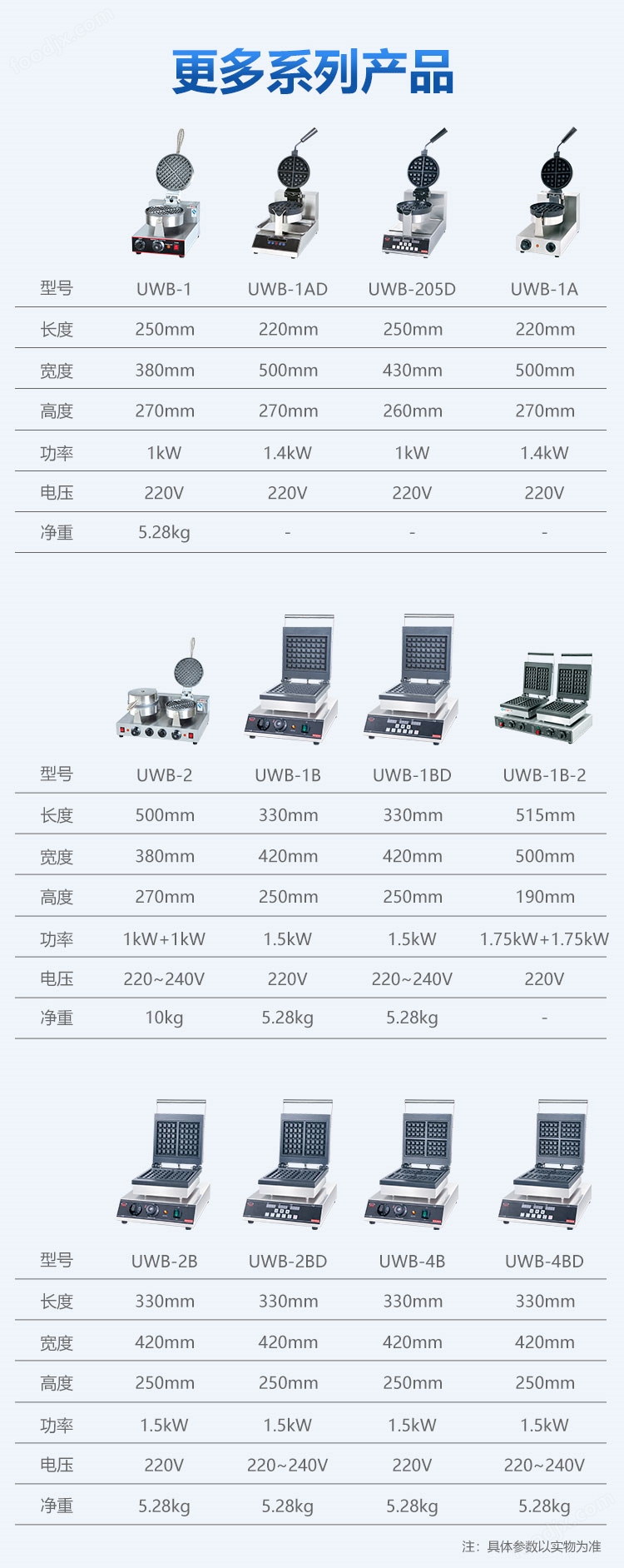 特 性:1.豪华外形设计,整机结构安全合理.2.采用铸铝烘炉板,烘炉直径178mm.3.配有温控器和定时器.4.不锈钢结构,不粘层模板、节能省电 u 双头华夫炉电 源:220V50Hz功 率:2.0 KW外形尺寸:500 X 380 X 300 MM特 性:1.豪华外形设计,整机结构安全合理2.采用铸铝烘炉板,烘炉直径178mm3.不锈钢结构,不粘层模板、节能省电产品名称型号外形尺寸(mm)功率(kW)单头华夫炉UWB-1250*380*3001双头华夫炉UWB-2500*380*3002单头雪糕皮机ZU-1250*380*3001双头雪糕皮机ZU-2500*380*3002