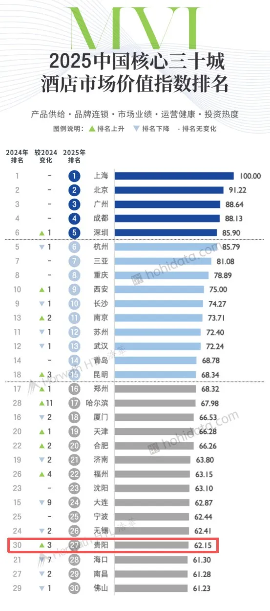 浩华发布的2025年酒店市场价值指数MVI排名中,贵阳上升3位,主要得益于投资热度和市场活跃度的回暖。