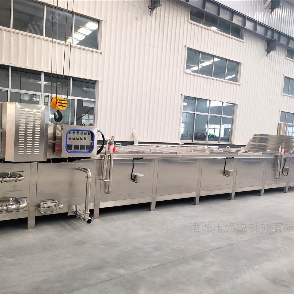 采用不锈钢材料、无污染。本机以水为灭菌介质,分灭菌槽、冷却槽两部分。整体采用不锈钢制作。可根据包装物的灭菌工艺不同对温度和时间进行任意设定改机以水为灭菌介质,分灭菌槽、冷却槽两部分。加热槽内根据热交换面积合理分布不锈钢无缝管钻孔直排式热交换装置,升温迅速,布温均匀并且配有一台循环水泵进行体外循环。加热部分采用压浮带,确保产品加热均匀和同步运行,水温自动控温部分采用手动、自动两套装置,安全可靠。加热方式采用锅炉蒸汽,冷却部分采用常温水冷却,冷却时间变频调速时间可调,冷却采用水浴和喷淋复合式降温,确保全部产品*冷却,配置破袋捞取装置,特别适合连续杀菌作业。灭菌*、品质高、不变色、包装材料密度不变,适合于不同产品的连续性巴氏灭菌。加热方式采用锅炉蒸汽,采用手、自控温系统,水质升温快、受热均匀、温差小、温度可调。