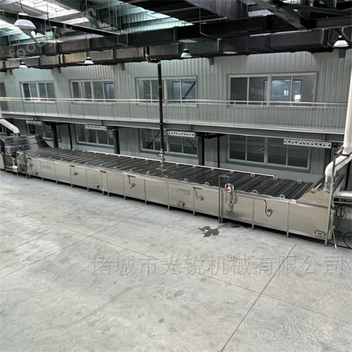 采用巴氏杀菌法,对各类包装产品蔬菜或罐装食品通过温度自动调节,将杀菌槽中的热水温度控制在80-90摄氏度之间,即能起到杀菌效果,又能保证蛋白质等营养成份不在较大温度范围内波动,保持食品原有的品质,达到对食品不加防腐剂和添加剂,而延长保质期,从而保护了人们的生命健康。同时对杀菌后的物品通过能却水进行冷却并用强风将包装物表面吹干后包装入库可延长食品储藏期。