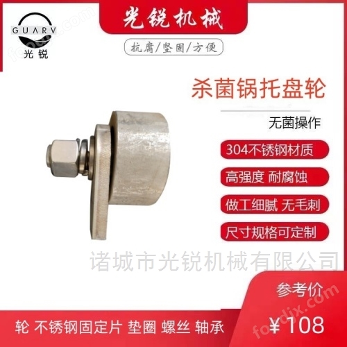 诸城市光锐机械有限公司专业定制杀菌锅托盘轮,用于杀菌锅盘进出不锈钢杀菌锅用,是杀菌釜的必要配件之一。规格涵盖有50、60、80等多种尺寸,可灵活匹配不同型号的杀菌设备,可配不锈钢支板。适配于各类杀菌锅推车上的托盘使用,产品均由304不锈钢材质精密铸造制作而成,耐腐蚀性强、耐高温、不易生锈、耐用,做工细腻无毛刺,配套有垫圈、支板、螺丝等配件,配件齐全拆卸简单组装方便,能够实现便捷高效的设备对接。