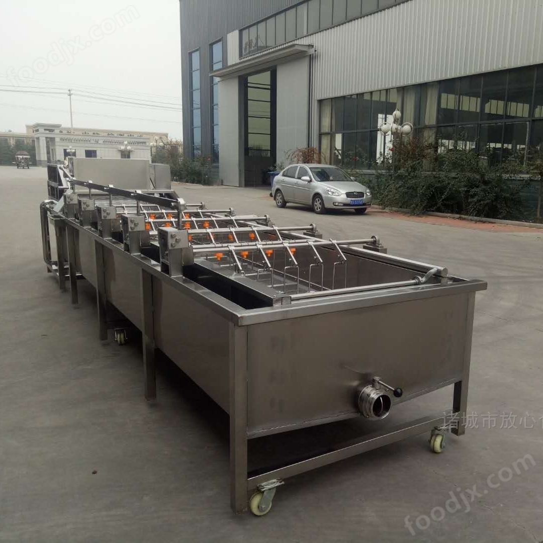 适合于各种水果、新鲜蔬菜、盐渍菜、蘑菇、菌类、海产品。该清洗机在物料输送过程中,增加了喷淋清洗功能,使物料在完成汽水浴清洗后,再经过喷淋清洗,该道工序的作用是将物料表面的脏水替换去除,提高物料的清洗效果,同时,外来的清洁喷淋水在对物料进行二次清洗后,水自动流入水浴槽中,达到替换补充水浴槽内的清洗水,保持了水浴槽内水质的清洁度,即提高了清洗水的利用率,又增加了清洗效果。