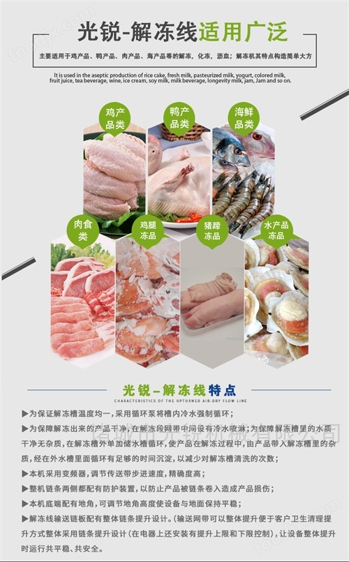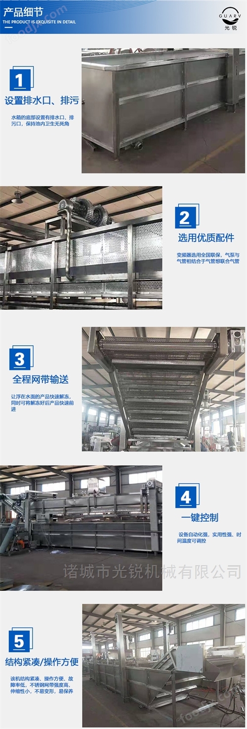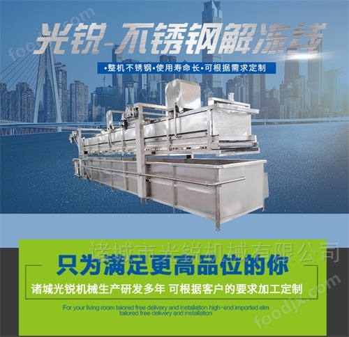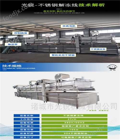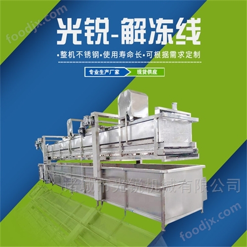 诸城市光锐机械有限公司解冻线可节约水资源,水可多次用于解冻多种产品;光锐机械解冻设备自动化程度高,节约人工,只要一个工人就可完成(1T/h-10T/h)的产量。