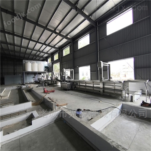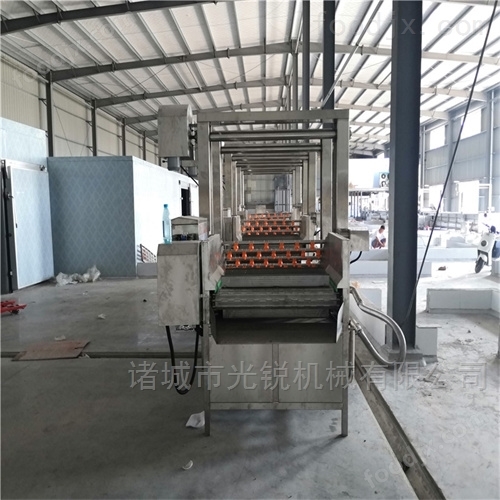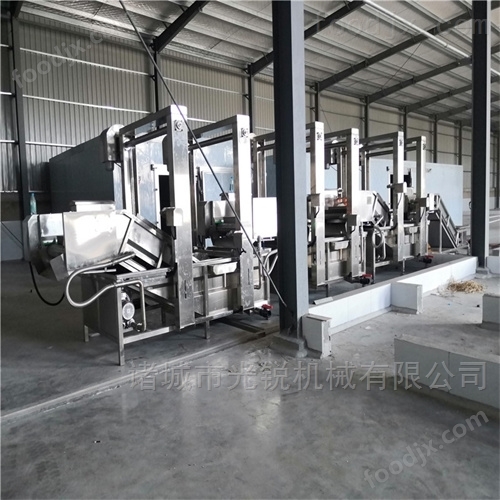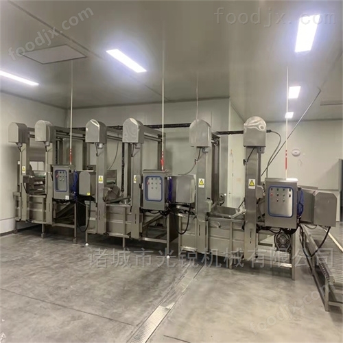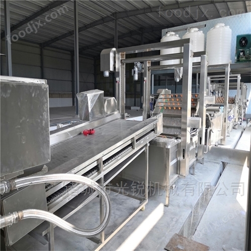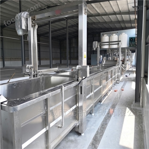 鸡爪解冻清洗蒸煮流水线特点:主要用于冷冻的鸡爪、鸭脖等分割禽肉类、带鱼、黄花鱼等鱼类的连续解冻;水可多次重复用于解冻多种产品,节约水资源;只要一个工人就可完成(1T/h-10T/h)的产量,节约人工。流水线优势:整个过程可阶段性控制,保持鸡爪、鸭脖等禽肉类原有的色泽;失水率低、蛋白质流失少;解冻过程快速均匀、能耗低;单位面积使用率高;流水线中的解冻部分设备也可作为冷藏保鲜的设备使用。