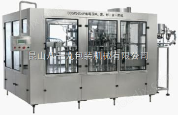 本系列设备用于聚脂瓶装各种碳酸饮料的生产。在一机上实现冲瓶、灌装、封盖。整机设计科学合理,外形美观,功能齐全,操作维修方便,自动化程度高。综合采用意大利、好技术。灌装速度快,液面控制稳。如:无瓶时不灌装,冲气或灌装时爆瓶则灌装阀将自动关闭,并有自动冲洗等自控技术。采用托瓶提升气 缸,油尼龙齿轮传动,噪声小,整机运转平稳。采用磁力扭矩式拧盖头,实现抓盖、拧盖功能。拧盖力矩无级可调,具有恒力矩旋封塑盖功能,且不伤盖,封口严密可靠。水平回转式气力理盖器,具有不损坏瓶盖表面,料斗内缺盖发信号自动补充盖等功能。整机采用PLC电脑程序控制及人机界面触摸屏按钮,具有料缸内液面自动控制,无瓶不灌装,无瓶不加盖功能,并有拨瓶星轮卡瓶错位停机,盖滑槽内缺盖停机等功能。