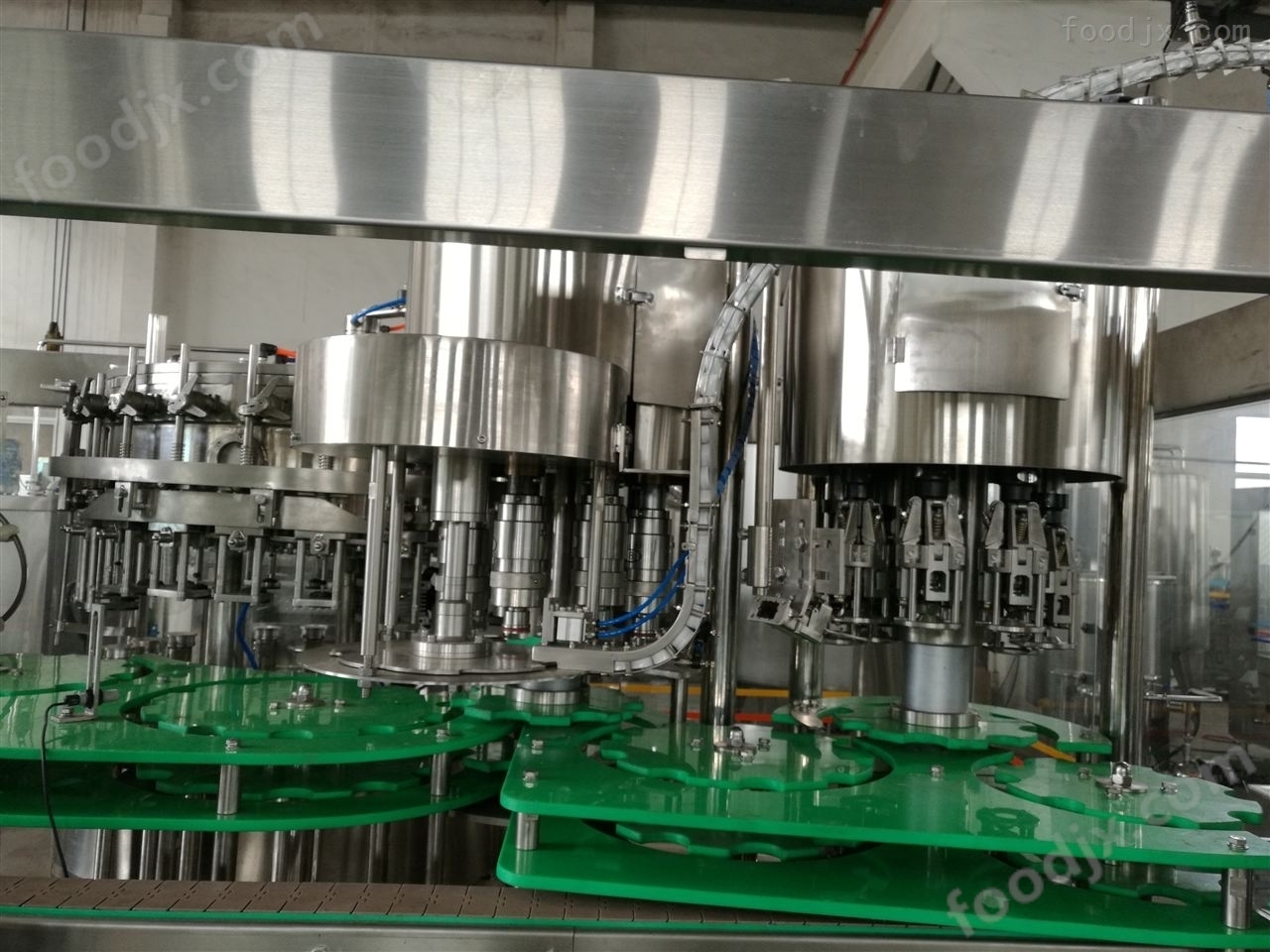 全自动盐汽水灌装生产线的主机采用冲洗、灌装、封口三合一,等压灌装原理,灌装阀采用等压式机械阀,灌装快捷灵敏,灌装液面精度高。对中导向采用导杆式对中,采用*的卡瓶口技术,保证瓶口与灌装阀的准确密封,减少了物料从瓶口泄漏的现象。主传动采用齿轮传动即开式组合传动,其效率高,噪声小,寿命长,维修方便,润滑充分,采用变频器对机器的主电机转速进行控制,碳酸饮料设备采用无级变频调速。导瓶系统,结构简单,可根据瓶型进行快速方便变更
